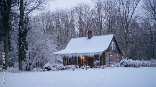 Classic winter house with icicles on roof, snow on trees, calm evening scene
