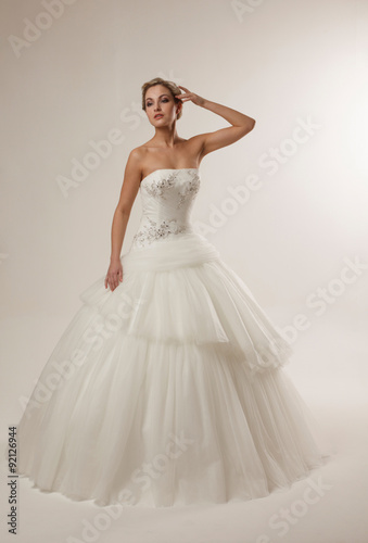 fashion, bride, bridal gown, wedding, looking away, beautiful, studio shot, vertical, cheerful, blonde hair, coiffure, standing, indoor, contemporary, femininity, female, young adult, smiling, caucasian, sensuality, luxury, white
