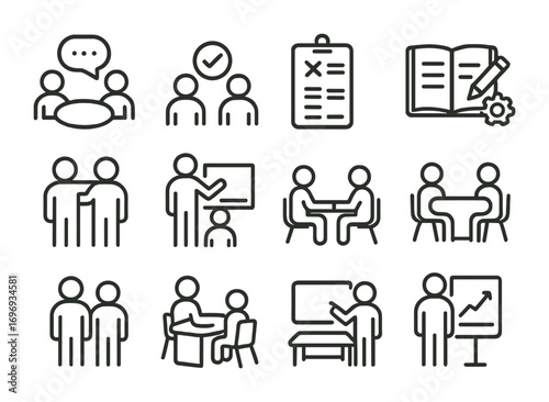 classroom, inclusion, icon, outline, icon, set, strategy, group, discussion, teamwork, visual, schedule, adapted, material, peer, support, teacher, guidance, collaborative, desk, learning, chart