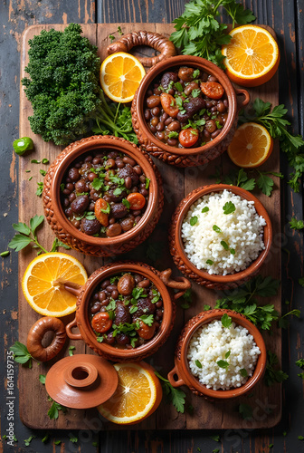 feijoada, brazilian, food, meal, traditional, stew, cookery, pork meat, south american, meat, rice, orange, sausage, authentic, delicious, epicure, homemade, rustic, cultural, hearty, typical, classic, national dish, comfort food, popular, lunch, dinner, culinary, healthy, protein, rich, flavorful, iconic, ceramic, earthenware, cooked, serving, crockery, gastronomy, preparation, fresh, vibrant, hot, spicey