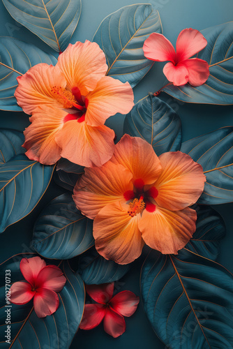 Clean and modern image of vibrant flowers and leaves arranged in a geometric pattern, printed in risograph style,