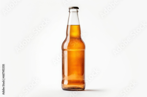 Clean glass transparent beer bottle with beer closed with a cap. Isolated on white background. Glass bottle with lemonade or any other yellow-brown drink. Template, mockup for design. With copy space.