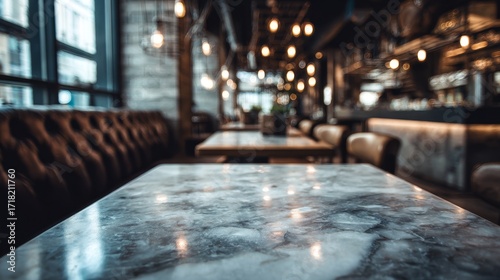 Clean marble tabletop in luxury restaurant interior. Premium blurred background