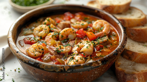 Clean shot of classic bouillabaisse with fish, seafood, and bread on a white background