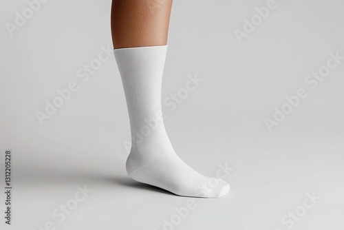 Clean White Crew Socks Mockup on Leg, Realistic Fabric Texture, Lifestyle Product Shot