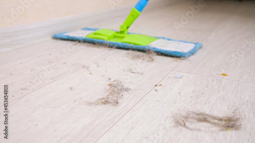 Cleaning modern wooden floor from shreds of hair, dust and dirt with soft mop in room during tidying up