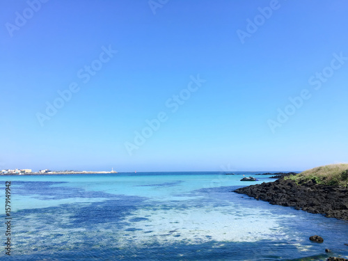sea, sky, coast, rock, ocean, beach, blue, water, nature, landscape, summer, horizon, calm, travel, shore, tropical, scenic, island, bay