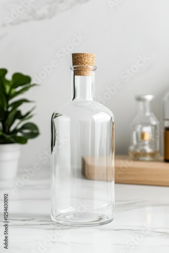 Clear bottle with cork, on marble kitchen counter, plants, for olive oil, vinegar