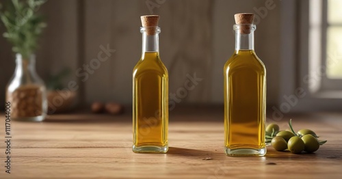 Clear glass bottle filled with golden olive oil on a wooden table , oil, clear bottle, food