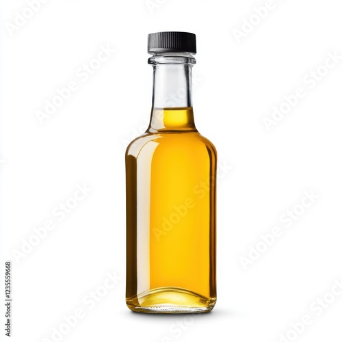 Clear glass bottle of natural oil with a shiny cap and golden hue on a minimalist white background