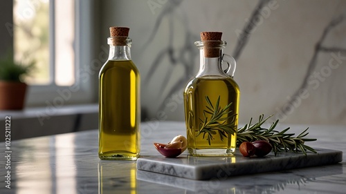 clear glass bottle of olive oil with sprigs of rosemary and garlic cloves, sitting on a marble countertop, with soft natural light highlighting the bottle’s clarity.