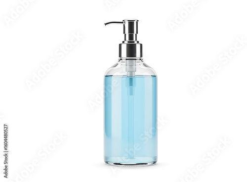 Clear glass bottle with blue liquid and chrome pump dispenser