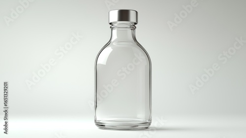 Clear glass bottle with silver cap stands on a white surface against a white background