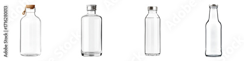bottle, glasses, clear, empty, collection, set, cardboard box, drink, water, liquid, container, sustainable, product, isolated, white background, still life, design, transparent, cork, cap, aluminium, beverage, alcohol, vodka, gin, oil, vinegar, sauce, environmentally friendly, minimalist, modern, studio shot, single object, recyclable, storage, blank