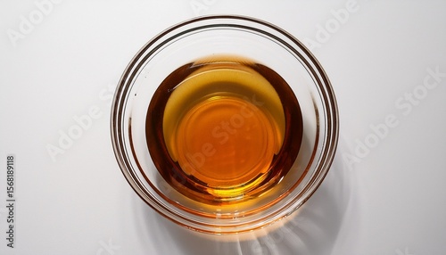 clear glass bowl filled with amber liquid sits on white surface casting soft shadow liquid rich color suggests warmth and depth creating serene and inviting atmosphere