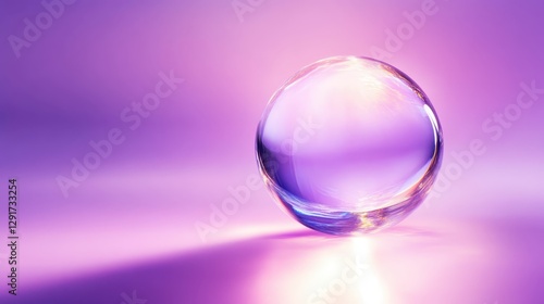 Clear glass sphere reflecting purple hues on a smooth surface, creating a captivating light display in an artistic setup