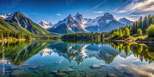 Clear mountain lake reflecting surrounding peaks, untouched by pollution, a sanctuary of purity and tranquility