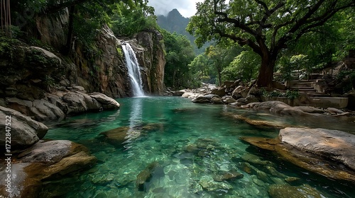 waterfall, river, jungle, tropical, rainforest, stream, rock, forest, mountain, nature, fresh, wilderness, scenic, landscape, tranquil, peaceful, serene, flowing, lush, greenery, natural, emerald, water, cascade, rock, green, fall, flow, fall, stone, travel, spring, creek, summer, tree, park