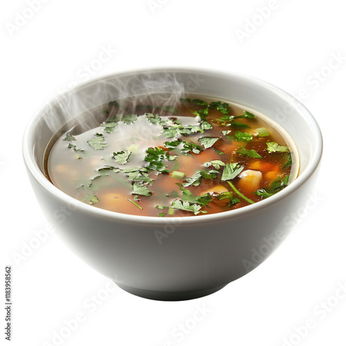 Clear soup with vibrant herbs, warm steam rising, set against a pristine white background, inviting and comforting culinary delight