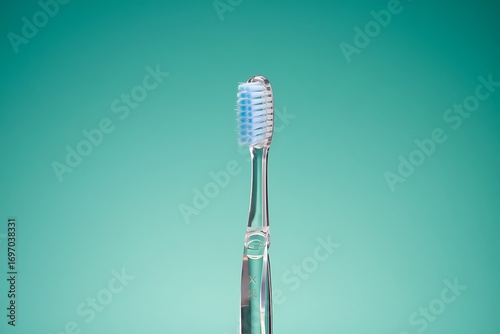 Clear Toothbrush with Blue Bristles on a Solid Teal Background for Dental Hygiene