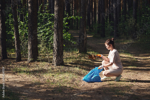 Clearing the forest of plastic non-recyclable waste. A young girl wearing gloves collects garbage in a bag. Saving the environment from an ecological disaster. Volunteers, eco activists concept