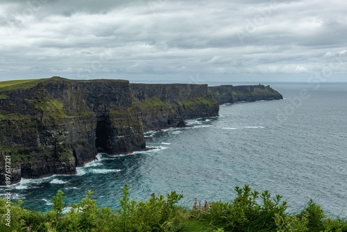 ireland, cliff, ocean, atlantic, wave, scenic, landscape, nature, cloudy sky, coastline, travel, tour tourism, europa, natural beauty, sea, rock formation, green, rugged, dramatic, outdoors, horizon, famous landmark, irish, coastal, scenery, majestic, moody, overcast