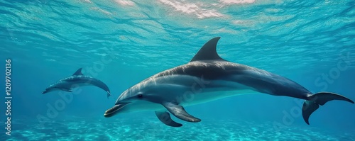 climate change carbon dioxide policy concept. Two dolphins swim gracefully in crystal-clear ocean waters, showcasing their sleek bodies in a vibrant underwater scene.