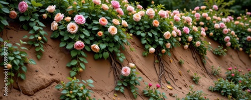 climbing, rose, covering, slope, root, holding, dirtied, erosion, cinematic, photorealistic, wide, shot, capturing, protective, effect, vividly, ai, generative