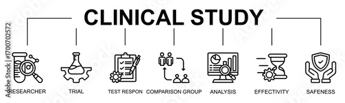 Clinical Study banner web icon vector illustration concept with icon of clinical study, researcher, trial, test, response, comparison group, analysis