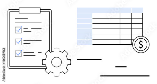 Clipboard with checklist, gear symbolizing settings, spreadsheet with dollar icon. Ideal for task management, finance, productivity, planning, budgeting, data analysis simple landing page
