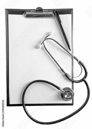 Clipboard with stethoscope, isolated on white