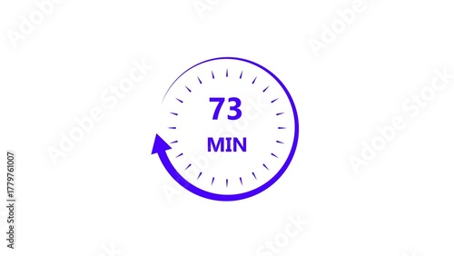 Clock icon 73 minute purple color animation. Stopwatch in flat style 73 minute on white background.