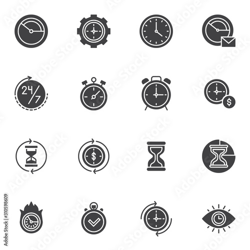 Clock time vector icons set, modern solid symbol collection, filled style pictogram pack. Signs, logo illustration. Set includes icons as stopwatch chronometer, alarm clock, hourglass, setting time