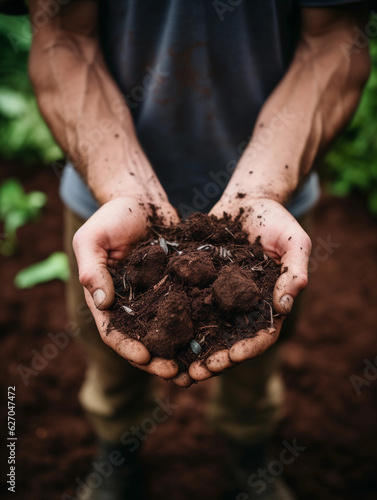 Close - up of hands holding rich, finished compost, crumbling it, ready for use in garden, earthy and organic