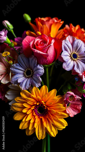 flower, bloom, blossom, colourful, vibrant, bright, pink, blue, yellow, green, black, background, close, detail, pleated, center, dark, natural, garden, flora, botanical, spring, summer, beauty, joy, life, art, macro, still, floral, arrangement, bouquet, composition, texture, light, shadow, contrast, aesthetic, organic, nature, soft, delicate, fragile, fresh, high-coloured