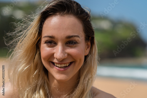 close, smiling, young, woman, happy, beach, people, fun, caucasian, blond, lifestyle, portrait, female, happiness, face, healthy, smile, natural, cheerful, looking, playful, casual attire, horizontal, model, teeth, closeup, adult, positive, expression, european, confident