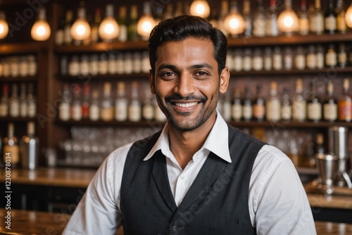 close portrait of a 40s smiling Indian male bartender against blurred bar background