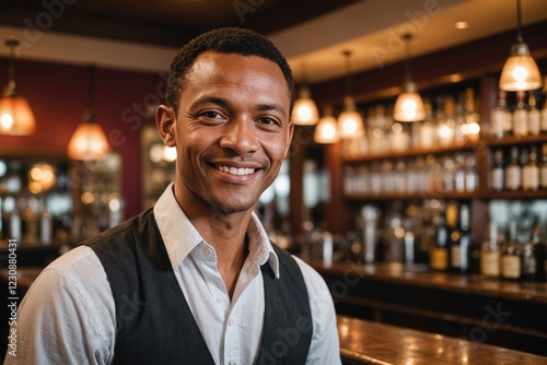 close, portrait, 40s, smiling, male, barkeeper, blurred, bar, background, african, man, person, cheerful, joyful, happy, men at work, employee, hospitality, service, industry, uniform, occupation, professional, photogenic, friendly, ethnicity, indigenous, madagascar, island, traditional, culture, job, career, skilful, experienced, international, client, serving, drink, cocktail, beverage, alcohol, nightlife, celebration, party, event, relaxation, atmosphere