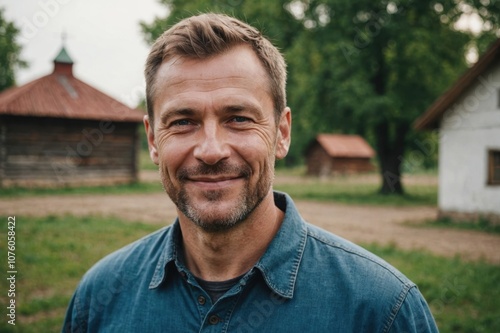 Close portrait of a smiling 40s Russian male farmer standing and looking at the camera, outdoors Russian rural blurred background