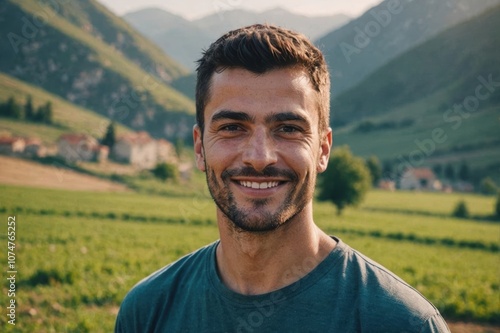 Close portrait of a smiling young Albanian male farmer standing and looking at the camera, outdoors Albanian rural blurred background