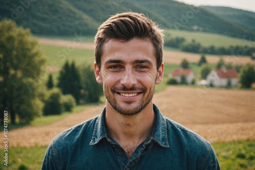 Close portrait of a smiling young Croatian male farmer standing and looking at the camera, outdoors Croatian rural blurred background
