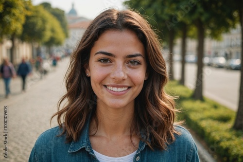 Close portrait of a smiling young Portuguese woman looking at the camera, Portuguese outdoors blurred background