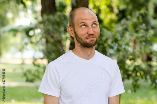 natural, white, green, horizontal, portrait, model, european, processing, process, outside, outdoors, park, dreaming, thinking, idea, concept, lifestyle, looking, beard, summer, guy, face, smile, attractive, 1, casual attire, people, happy, photogenic, young, adult, nature, person, man, male, he, father, father