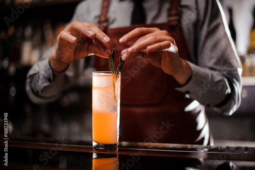 apricot, bar, barkeeper, berry, cocktail, cocktail bar, colours, drink, fruit, hand, ice, light, mint, natural, red, sage, soft, sour, strawberry, water, nightclub, barkeeper, wine, whiskey, vodka, shot, pub, eatery, tequila, spirit, mixing, macro, orange, man, male, closeup, work, white, professional, job, alcohol, apron, foam
