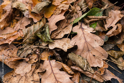 Close up autumn leaves in a forest