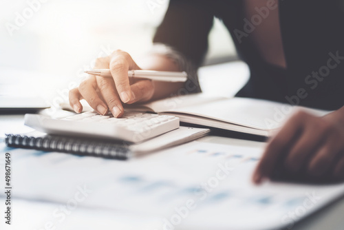 Close up Business woman hand using calculator to calculate the company's financial results and budget. Account Audit Concept.