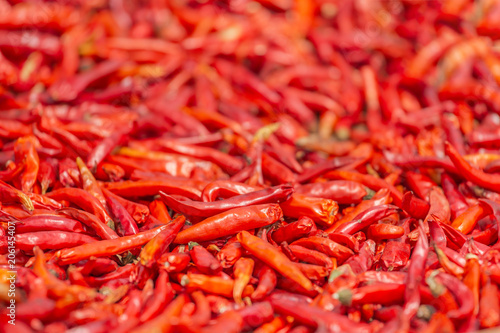 Close up dried red hot chillies in sunny day