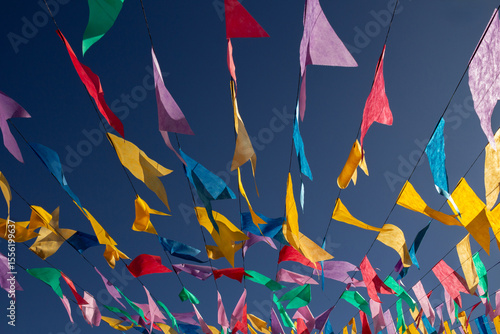 Close up em vários barbantes com bandeirolas coloridas balançando, com céu azul ao fundo.
