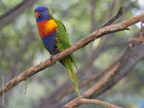 close up exotic colorful red blue green parrot Agapornis lorikeet sitting on the tree branch