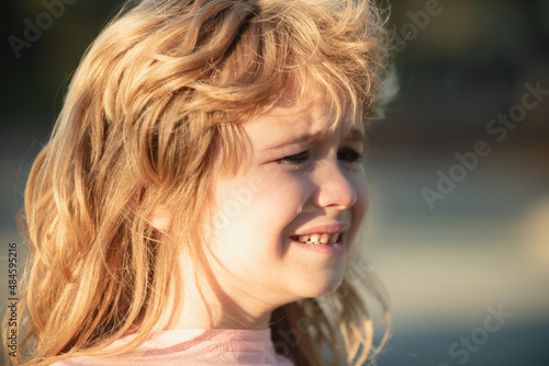 Close up face of child crying. Tears on kids face closeup.